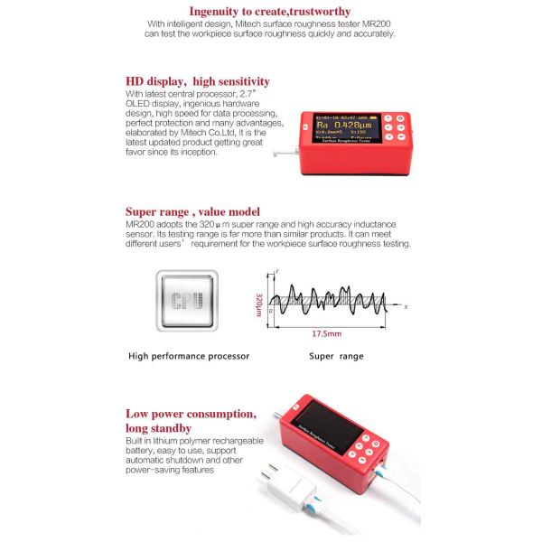The MR200 surface roughness tester is a new upgrade instrument which adopts the newest processor. This instrument adopts 2.7 inch OLED display, combines accurate measurement, exquisite design, fast process rate and complete protection in one host. It is highly favored by users since it was produced, it has large measurement range, superior than other similar products and can meet different needs of users. By connecting with Micro-USB port, Bluetooth, SD card, it can do wireless remote control, measurement, print and communicate with PC and store massive data. It has been widely used in the quality control process of various precision metals, plays an important and necessary role in rising production qualification rate and saving cost.