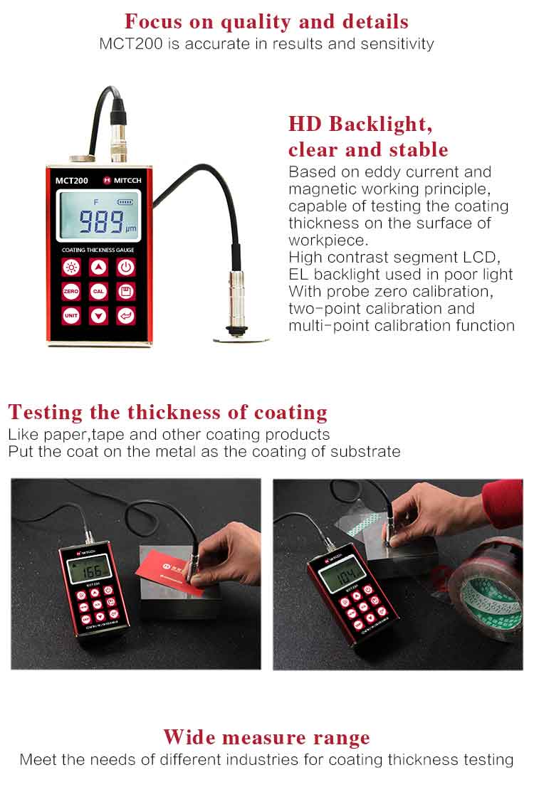 MCT200 Coating Thickness Gauge is designed for non-destructive, fast and precise coating thickness measurement and also can measure the film thickness. It is widely used in manufacturing,metal processing industry, chemical industry.commodities inspection and other testing areas. Measuring range from 0 to 10 mm, can meet the different industries in view of the workpiece surface coating thickness testing requirements. It is the necessary professional precision instrument to improve the production efficiency and the qualified rate, saving the cost of production.