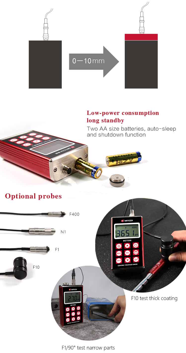 With different external probes, the gauge can be applied to measuring thickness of non-magnetic coating on magnetic metal substrate, as well as non-conductive coating on non-magnetic metal substrate.