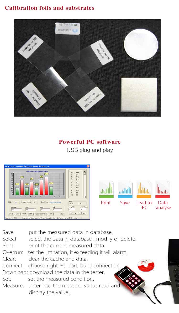 The gauge equips with data-pro software, can do measurement results transmission, automatic storage management, measurement data analysis, measurement reports print etc.